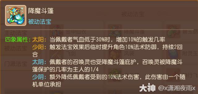 分析:化生可选法宝之一,对于法宠的伤害有质的提升。日常、部分难度活动和PK,首发法宠进行面伤推进时,可以舍弃防御性法宝带它,推荐太阴和少阴,新手洗到哪个就用哪个