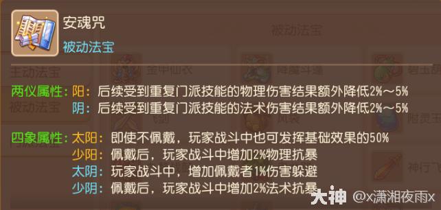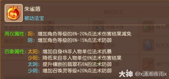 分析:门派法宝属于特殊的主动法宝,不管是两仪阳属性的法防加成还是阴属性的物防加成,对于新手化生来说都必不可少,所以不考虑使用后的效果如何,只取两仪的三条属性,增加自己的法防和物防