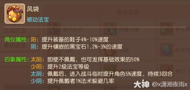 分析:化生可选法宝之一,除了法抗和治疗以外,速度对于化生来说也很重要,而风袋提供的速度加成非常可观,太阴能够在进入战斗3回合内临时提升5%速度,而少阴能够增加法术躲避,对于新手来说洗到哪个就用哪个