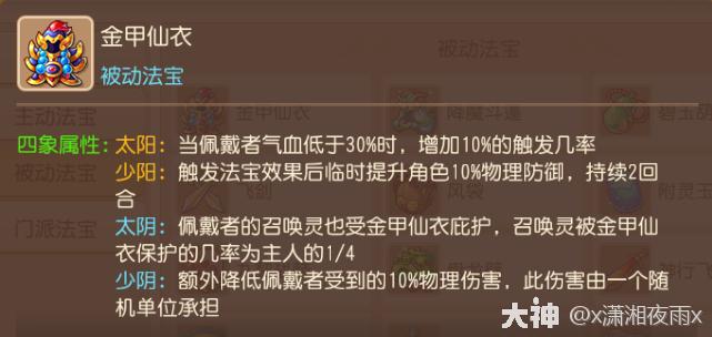 分析:化生可选法宝之一,满层效果为:佩戴者受到物理攻击时,20%几率降低40%伤害(不包含两仪和四象效果)。尽管是概率触发的法宝,但是一旦触发就能减免大量伤害结果,尤其少阳效果还能临时提高2回合的10%物理防御,堪称神技!对比玄武甲,造价更低