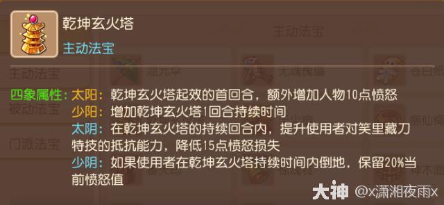 分析:化生必升法宝之一,由于化生会频繁使用大特技罗汉、晶清等,而乾坤玄火塔恰好能够提供稳定的愤怒值,不管是太阳首回合增加的10点愤怒还是少阳增加1回合持续时间,都是不错的选择,对于新手来说洗到哪个就用哪个