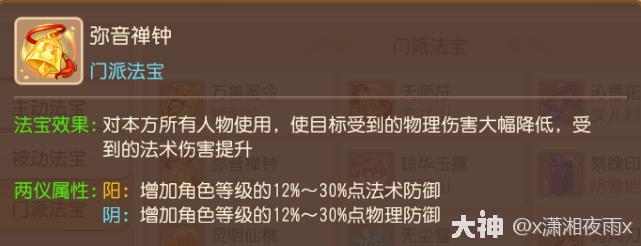 法宝效果:对本方所有人物使用,使目标受到的物理伤害大幅度降低,受到的法术伤害提升