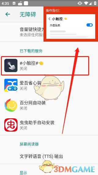 2、进入无障碍设置界面中,打开小触控并允许权限即可,不同机型的设置页面有细微不同,详情操作也可查看右上角视频演示