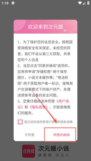 1、打开次元姬小说APP,点击同意按钮以顺利进入应用界面,确保接受所有相关协议。