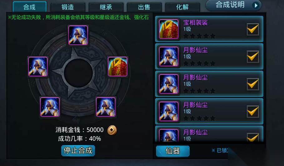 锻造券、幸运符等道具要精准使用,普通合成无需浪费,留到合成4阶以上仙器时使用,既能提升成功率,又能降低金币消耗。合成前可先通过普通装备合成“试手气”,连续失败2-3次后再进行仙器合成,有玩家反馈这种方式能间接提升成功率。