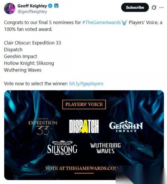 然而,竞争异常激烈。《丝之歌》作为备受期待的长红作品拥有深厚粉丝基础。《光与影:33号远征队》目前正势如破竹,横扫多个奖项。而《原神》曾在2022年引发巨大争议后夺得“玩家之声”奖,其粉丝动员能力不容小觑。若《33号远征队》或《丝之歌》同时赢得“玩家之声”与年度游戏大奖,它们将成为继2023年《博德之门3》之后第二款达成此双冠成就的游戏。