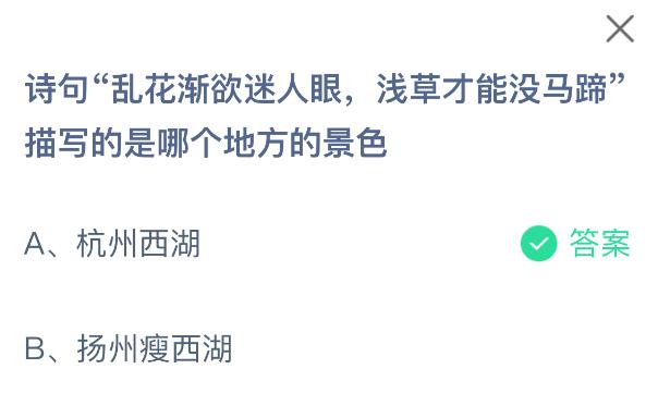 诗句“乱花渐欲迷人眼,浅草才能没马蹄”描写的是哪个地方的景色?支付宝小鸡课堂开课啦!每天花一分钟答题赚饲料,喂喂小鸡就能贡献爱心啦!轻松又意义十足!2025年12月13日蚂蚁庄园的小鸡课堂题目正确答案是【杭州西湖】,“乱花渐欲迷人眼,浅草才能没马蹄”出自唐代诗人白居易的七言律诗《钱塘湖春行》,该句通过"乱花""浅草"等意象组合,生动描绘了西湖早春时节百花渐次开放、春草初生的动态景象.