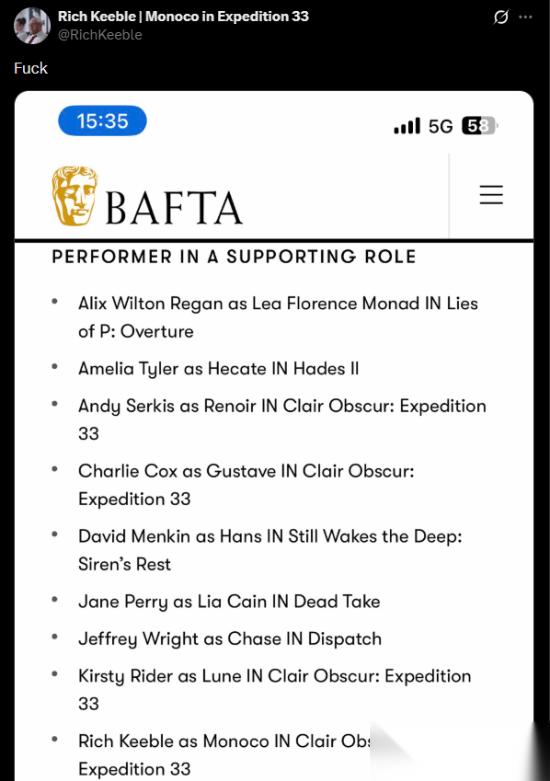 在近期公布的游戏奖项提名中,作品光与影:33号远征队表现亮眼,其四位配音演员共同入围了表演类最佳配角奖项的候选名单,引发广泛关注。其中,为角色莫诺柯配音的里奇·基布尔在社交媒体上分享提名名单时,仅用一个词表达心情——“法克”,语气中难掩惊讶与意外,似乎对能跻身这一竞争激烈的行列感到难以置信。