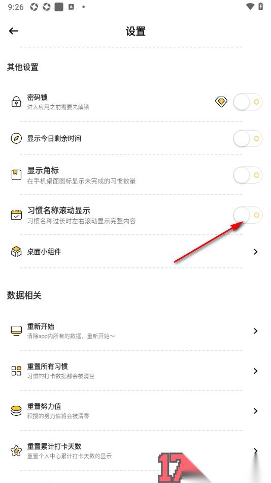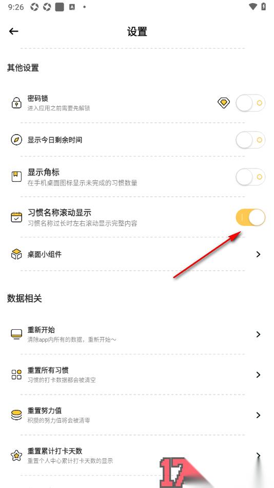 3.随后页面上会显示出多种功能内容,在页面上即可查看到显示的【习惯名称滚动显示】的开关按钮,将其点击开启。