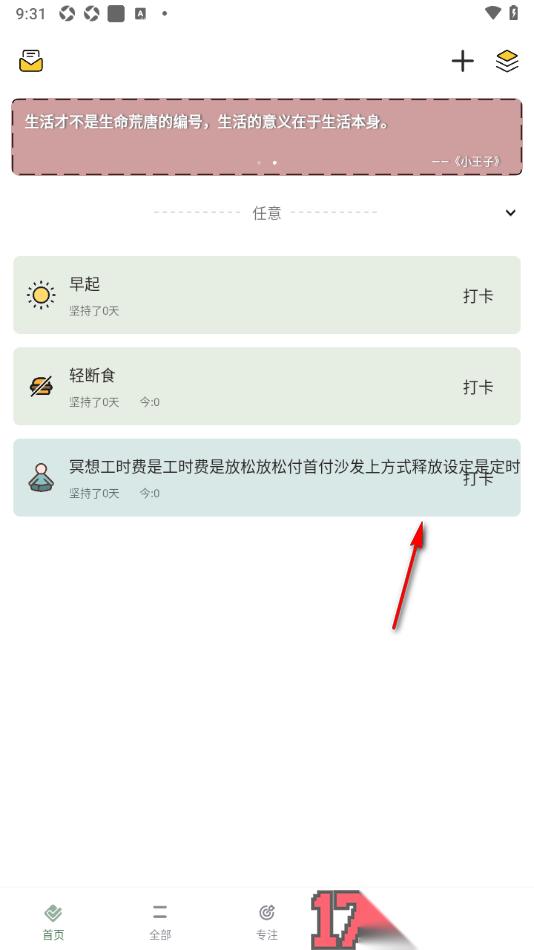 5.你可以新建一个习惯名称长的任务,这时候我们就可以在首页面上查看到该习惯的名称,直接用手指左右滑动名称即可查看详情。