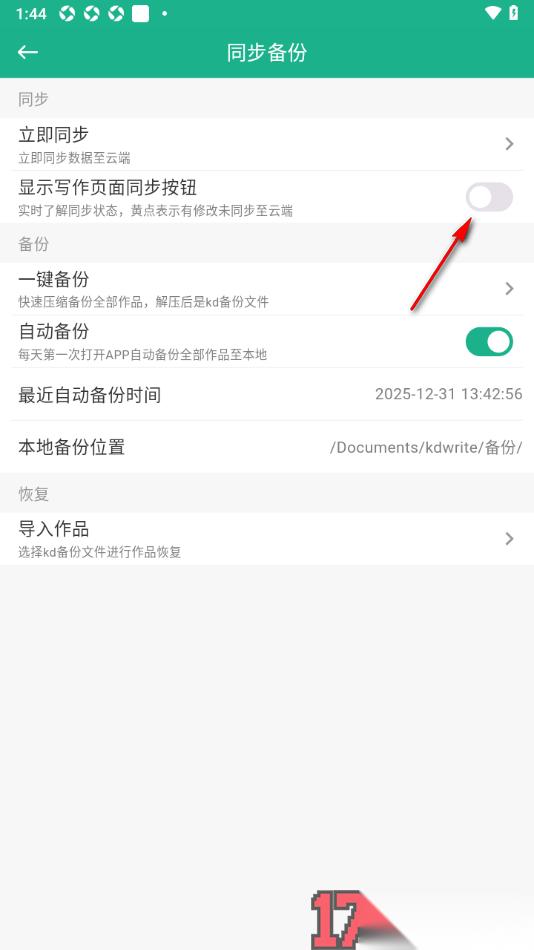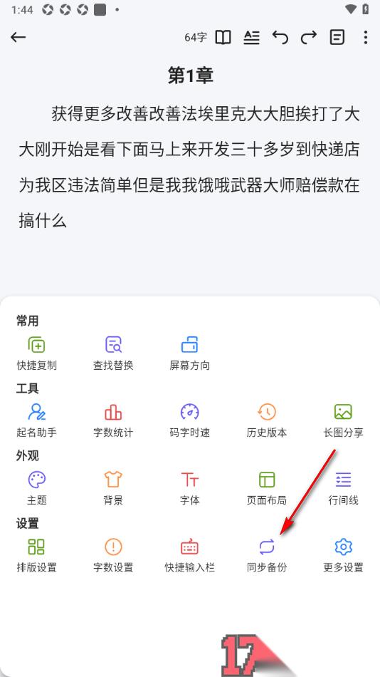 口袋写作app是一款用户们平时常常在使用的编辑文章内容的应用软件,相信很多用户对于该应用是非常喜欢的,在该应用中能够对编辑文字、段落以及背景等信息更改设置,同时还能设置自动备份文章内容,防止用户平时总是会忘记保存编辑好的内容导致内容不小心丢失的情况,如果想要快速的进行同步备份,用户可以在编辑页面上添加一个同步备份的快捷图标,平时想要备份内容时点击该图标即可快速同步备份,对此需要进入到菜单页面中将同步备份功能点击打开,启用显示写作页面同步按钮功能即可。