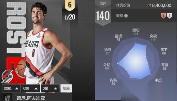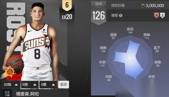 上版本的阿伦在外线就已经非常准了,而新版本又加了7点三分,数值直接到达145,徽章方面升级了银强投高手和无球跑位;