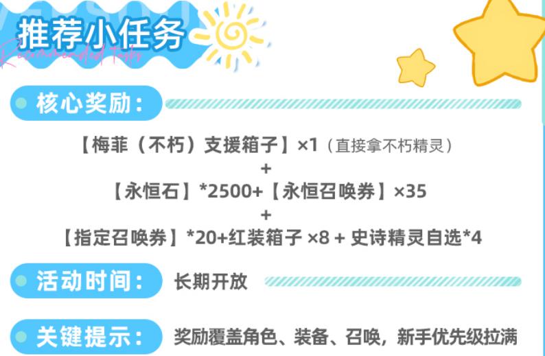 “推荐小任务”为常驻引导型成长系统,全程无难度门槛。整套任务链共提供2500颗永恒石,同时附赠35张永恒召唤券、20张指定召唤券、8个红装宝箱及4个史诗精灵自选权。任务内容均围绕基础玩法展开,如通关普通副本、提升角色等级、激活技能树等,基本与新手流程同步推进,自然完成率极高。入口位于主界面右侧功能栏,进度实时可见,建议优先完成以快速解锁多重资源。