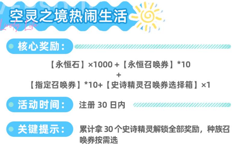 “空灵之境热闹生活”活动限时30天(自注册日起计算),达成累计收集30个史诗精灵的目标后,即可解锁全部奖励,包括1000颗永恒石、10张永恒召唤券、10张指定召唤券及1个史诗精灵召唤券选择箱。该目标在常规推图与日常抽卡节奏下可自然达成,无需额外刷取,奖励结构均衡,兼顾资源、抽卡与定向培养需求,综合价值突出。