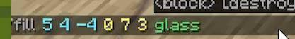 3、然后在指令栏的坐标前输入“/fill”,在坐标后输入想要填充的材质,如玻璃。