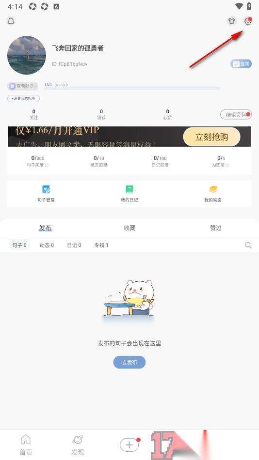1.在我们手机上将句子控app点击打开,即可在打开的页面底部菜单栏中选择我的选项,将其点击一下即可进入。