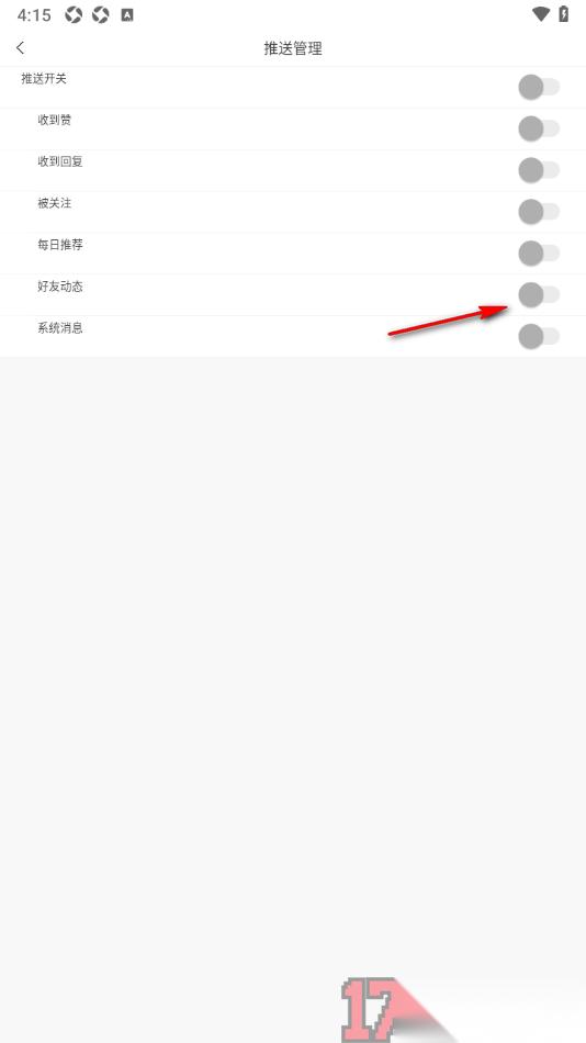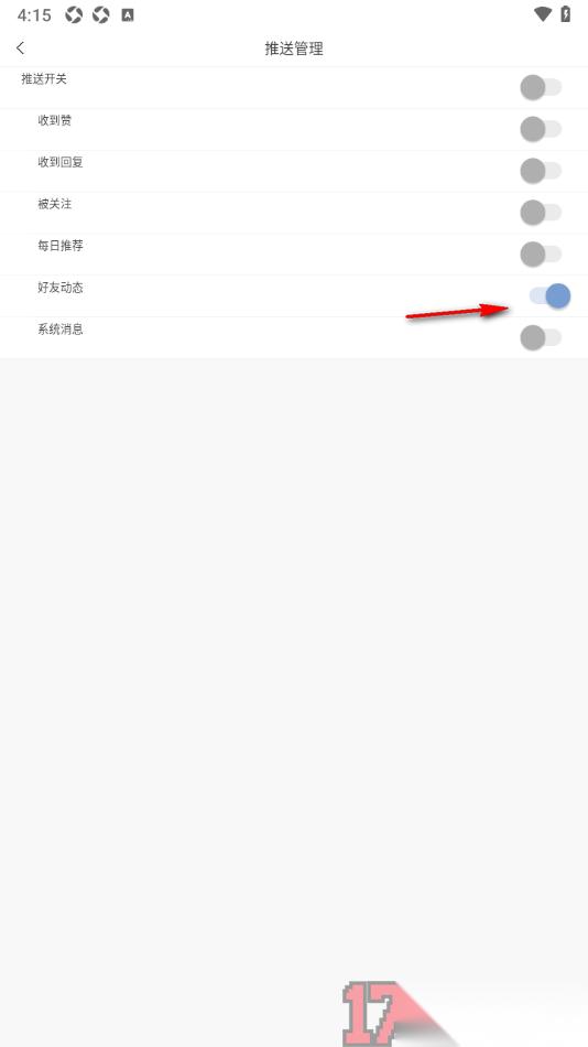 4.来到页面上会查看到多个推送通知选项,在这里直接将【好友动态】功能后面的开关按钮点击开启就好了。