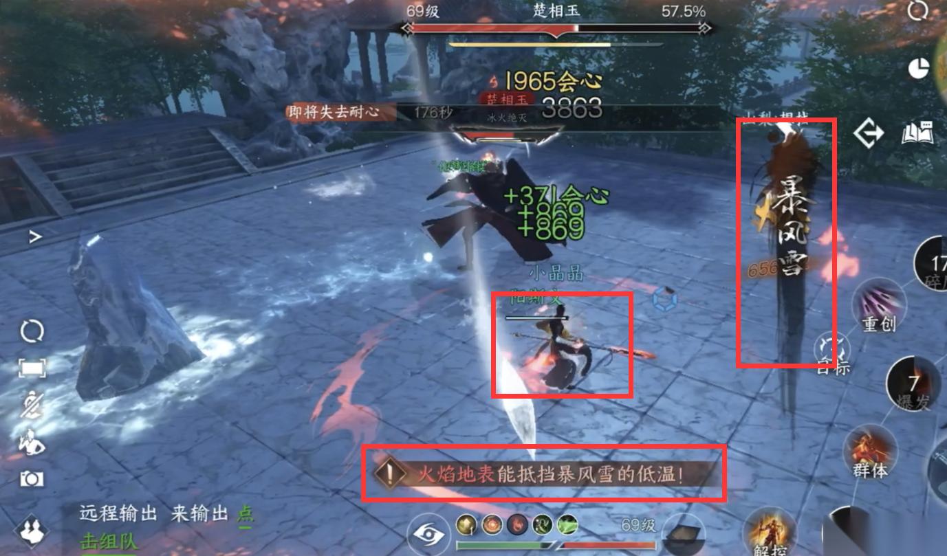 2.楚相玉释放暴风雪的时候,大家站在地上的火堆上即可躲避伤害!