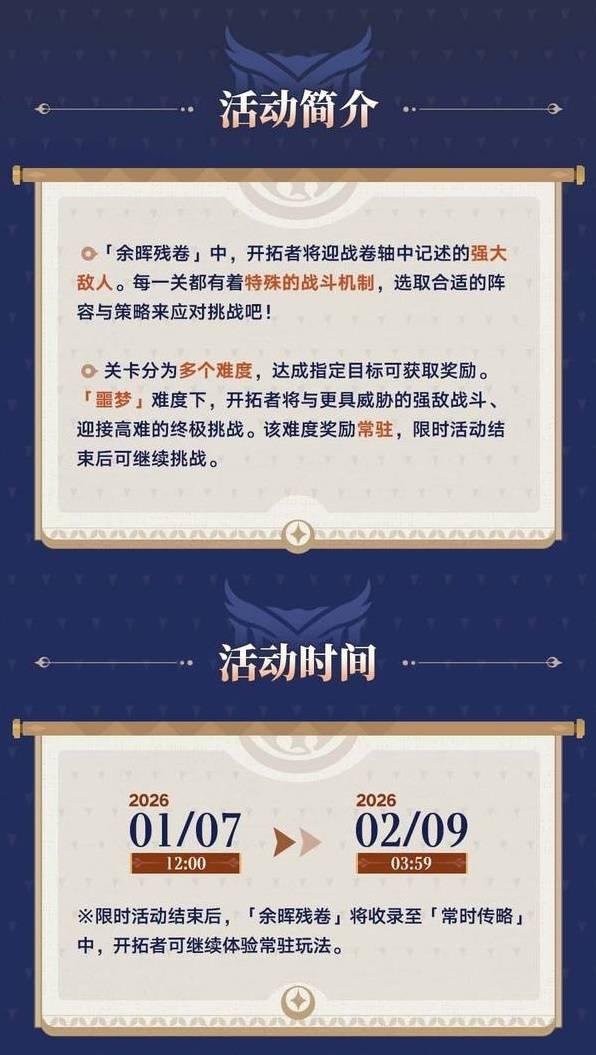 《崩坏星穹铁道》中余晖残卷活动已经开启,本次活动有着一定难度,想要了解玩法的玩家请看下面“官方”带来的《崩坏星穹铁道》余晖残卷活动攻略,希望能够帮助大家。