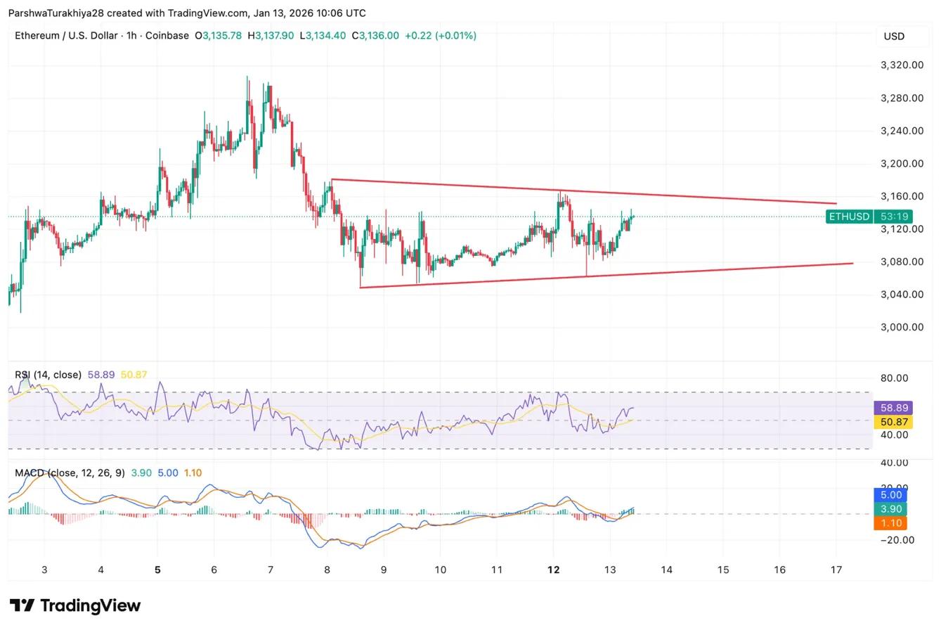 如果价格跌破 3080 美元的三角形支撑位,则突破将成为假突破。这将暴露 3000 美元的支撑位,如果抛售加剧且 1 月 15 日 Bitmine 股东投票结果令人失望,价格可能进一步下跌至 2900 美元。