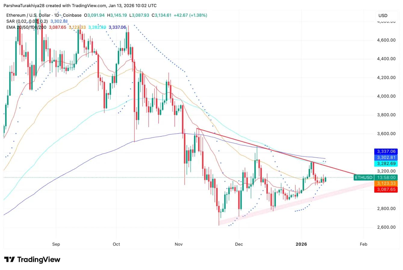 Bitmine 40亿美元的持仓、机构投资者采用率的提高以及现货资金的积极流动,共同构成了看涨的基本面。如果以太坊价格突破3200美元并重新站上3302美元的抛物线转向指标(Parabolic SAR),则三角形突破形态得到确认,初步目标价位为3500美元,如果动能持续增强,则有望进一步上涨至3800美元。