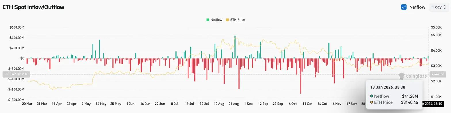 交易所资金流动数据显示,1月13日现货资金流入4128万美元,表明在经历了2025年全年资金流动波动期后,市场开始积聚资金。当Bitmine等机构投资者与散户资金同步买入时,通常预示着持续的上涨行情,而非短暂的反弹。