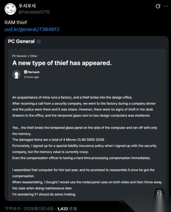 在韩国一个公开论坛上,有用户分享了一起案例:有小偷闯入公司的办公室,打碎PC机箱的钢化玻璃,偷走了四条32GB美光内存条。