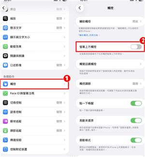 把 【萤幕上方触控】 的开关打开!搞定!(图2中的②)