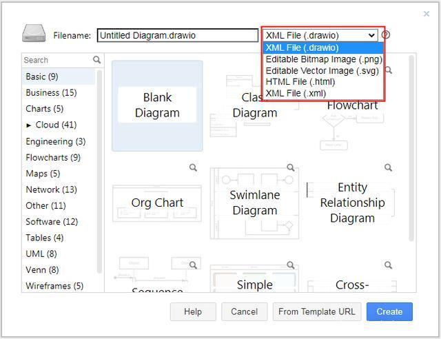 首先,选择文件的保存格式,包括drawio自己的格式,png图片格式,svg向量图片格式、html文件格式和 格式。