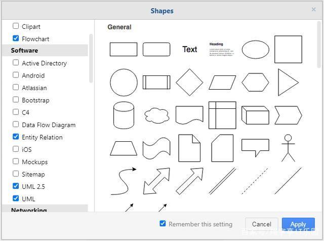 在弹出的“Shapes”界面的左侧,你想绘制什么图形,可以把其勾选上,然后在界面右下角点击“Apply”(应用)即可。这里勾选上了UML。