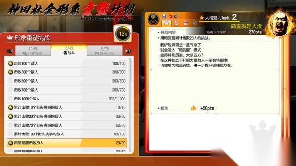 在形象重塑挑战中,可以通过完成各种各样的挑战任务来提升神田的评价。挑战的内容多种多样,包括打败小混混,或在娱乐场所大显身手等等。