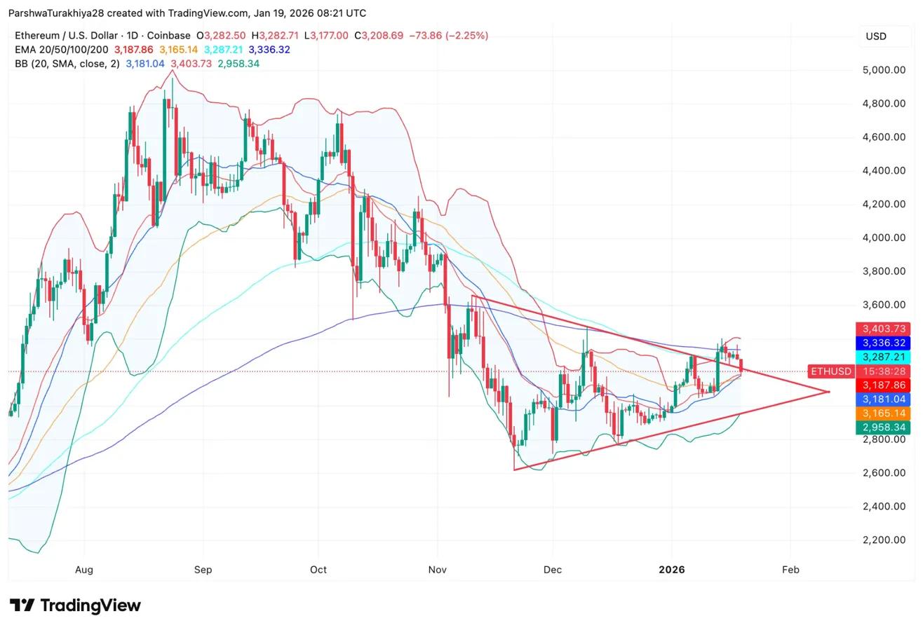 从日线图来看,自去年12月触及2800美元附近的低点以来,以太坊一直在一个对称三角形内波动。该形态显示,两条趋势线正在收敛,价格在3100美元的支撑位和3400美元的阻力位之间波动。