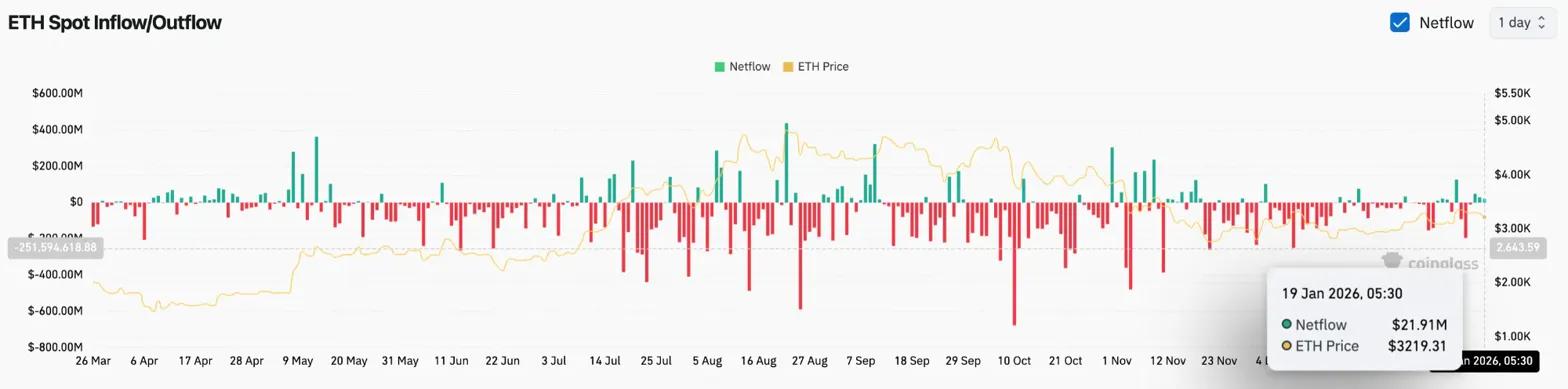 交易所资金流动数据与下跌的价格走势形成鲜明对比。Coinglass 数据显示,1 月 19 日净流入资金达 2191 万美元,这意味着现货持有者正在将 ETH 从交易所转移到私人钱包。