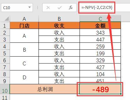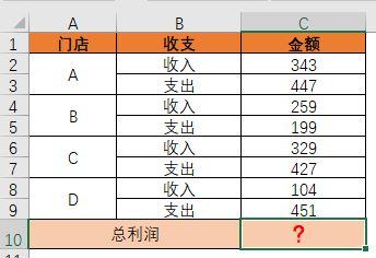 小 K 管理四家门店,每天都需要通过各门店的收支表计算总利润,每个门店的收支都用正数表示,如下图,如何设置 C10 单元格的计算公式才最简洁呢?