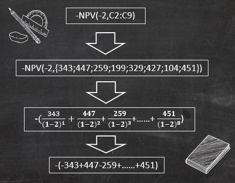 基于-1 的奇数次方为-1、偶数次方为 1 这一原理,NPV 函数第二参数的每一个奇数项取其相反数,偶数项取其本身,从而实现交叉求差运算。