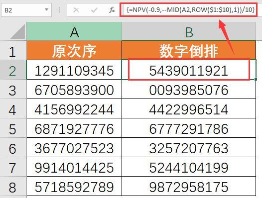 将 NPV 函数的参数 rate 设定为-0.9,于是 1/(1+rate)等于 10,A2 中的所有数字被依次乘以 10,100,1000......,再相加,就实现了将第 1 个数字填列在十位上,第 2 个数字填列在百位数,第 3 个数字填列在千位上,以此类推。最后将公式的整体除以 10,即可完成数字倒排。