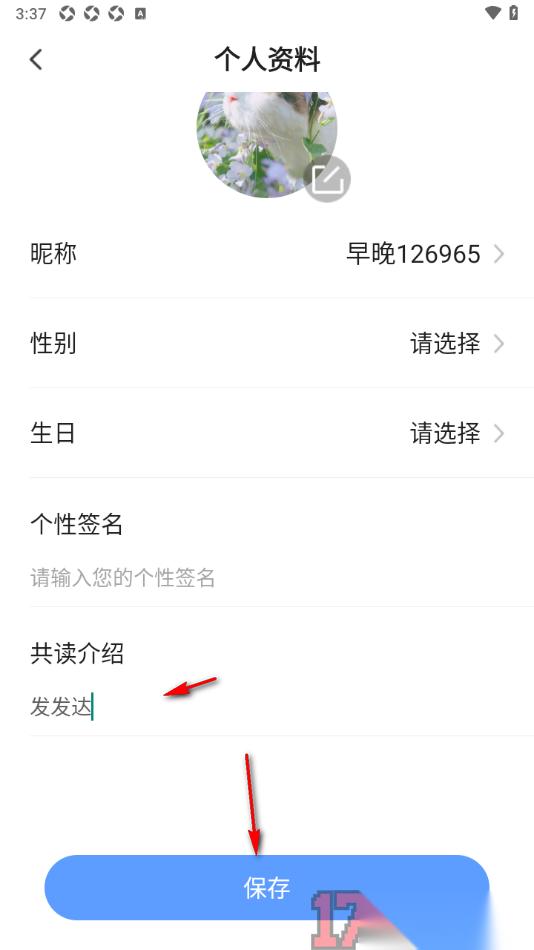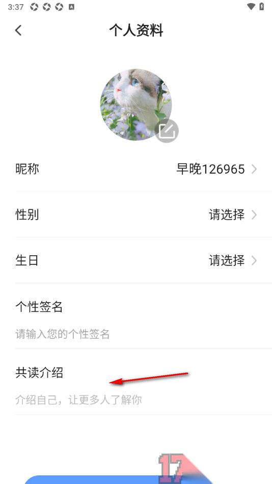 早晚读书app是一款非常受大家喜欢的阅读书籍的应用软件,相信不少用户对于该软件非常的喜欢,大家在该应用中可以阅读到关于哲理、金融以及一些讲解人物等相关书籍,若是想要在使用该应用的过程中获取到一些好友的关注和喜欢,那么可以将自己的个人资料信息完善清楚,在个人资料信息页面中提供了一个共读介绍功能,可以将自己感兴趣的共读内容填写进去,后期其他人在访问你的个人资料时即可查看到详细的情况,除此之外还可以设置一下个人资料中的昵称、性别、生日以及个性签名等内容。