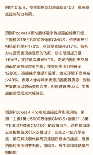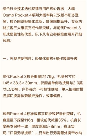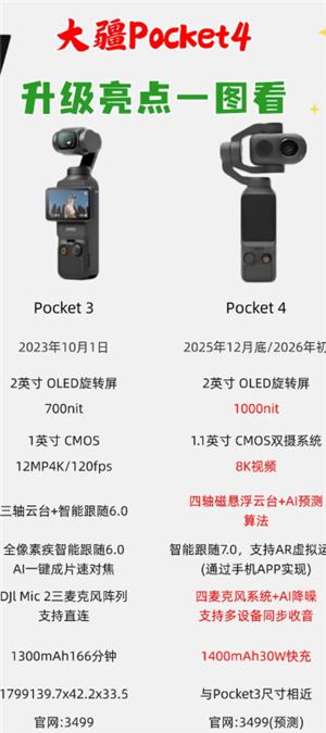 核心配置升级:从Pocket3的1英寸升级到1英寸+CMOS(或更大),新增超广角双摄