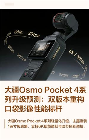 大疆Osmo Pocket 4系列将推出标准版和Pro版,主打轻量化、影像规格跃升和专业功能扩容。标准版搭载1英寸5000万像素CMOS,支持6K/30fps视频录制;Pro版采用双摄设计,支持6K/60fps,色彩格式升级,续航和传输性能优化。