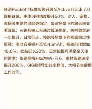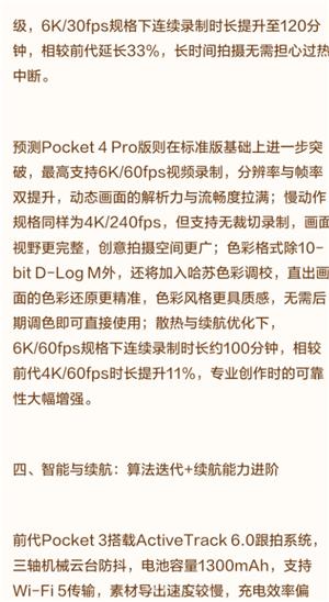大疆Pocket 4约在明年5月底推出,预计会在2025年底至2026年初发布,其中标准版可能在12月前后上市,Pro版会稍晚(不早于2025年第四季度)。