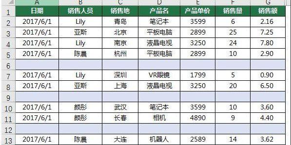 如图所示数据表中存在多余的空行,我们需要将这些空行删除掉。