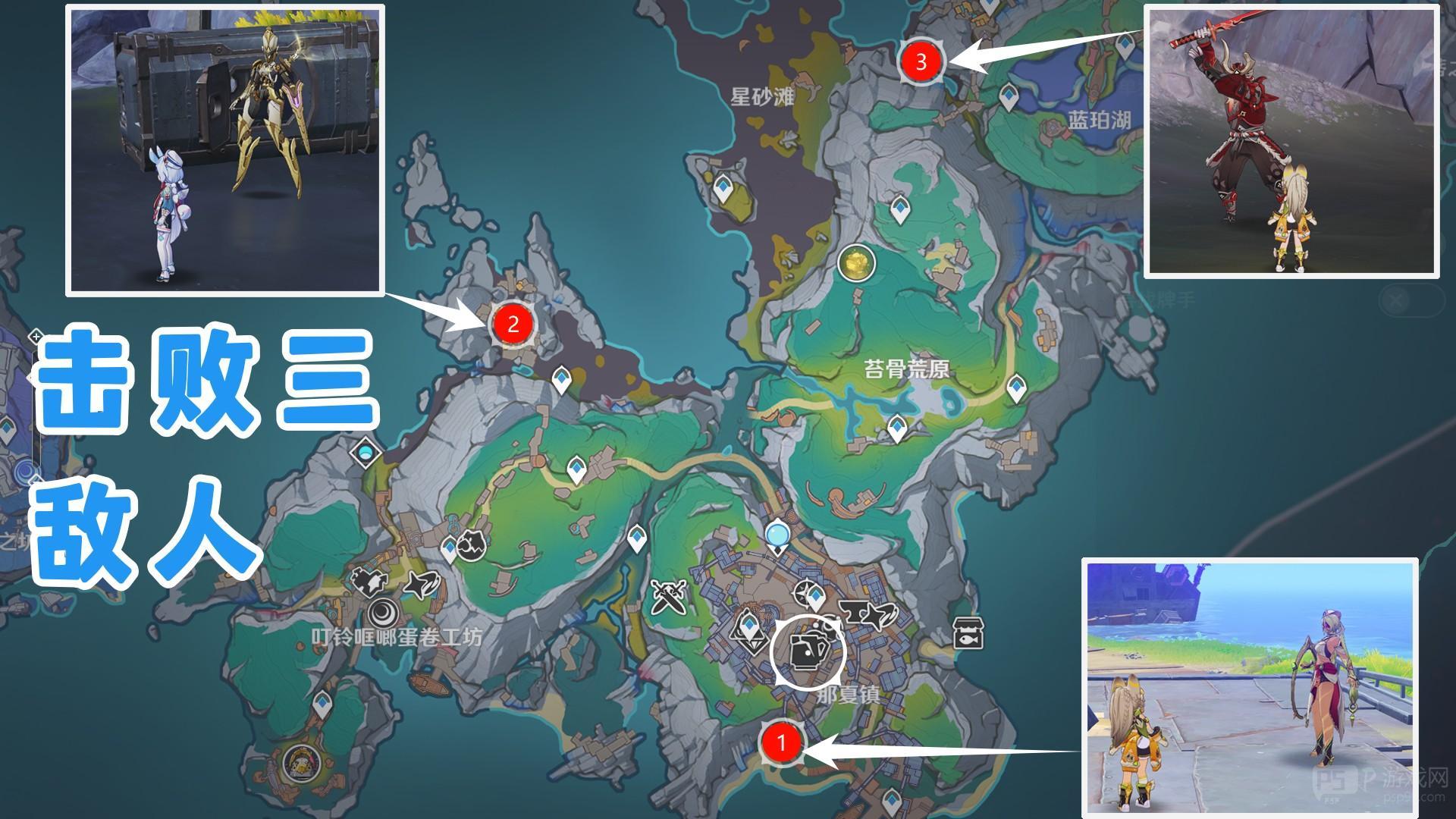 击败下图三处位置的敌人,最后回到酒馆与「勒塞克」对话,就能解锁宝箱和成就!
