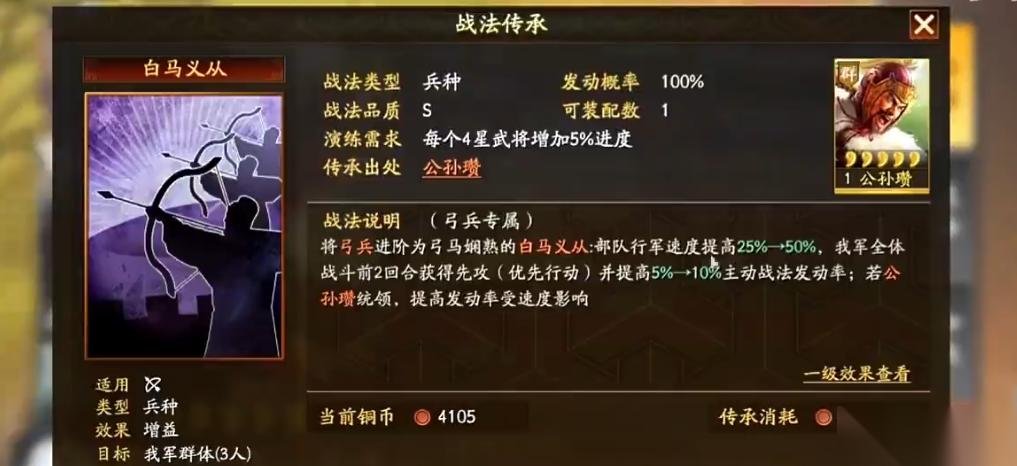 白马义从是一个由武将公孙瓒传承获得的S级战法,它属于弓兵专属的特殊兵种。这个战法的核心价值在于其提供的强大战术增益:配备后,部队的行军速度会大幅提升,增强了战场上的机动性与支援能力;在进入战斗后,它能为全体武将提供先攻状态,并显著提升队伍中主动战法的触发概率。携带白马义从的本质,是构建一支追求先手控制与高频爆发的速攻型弓兵队伍。