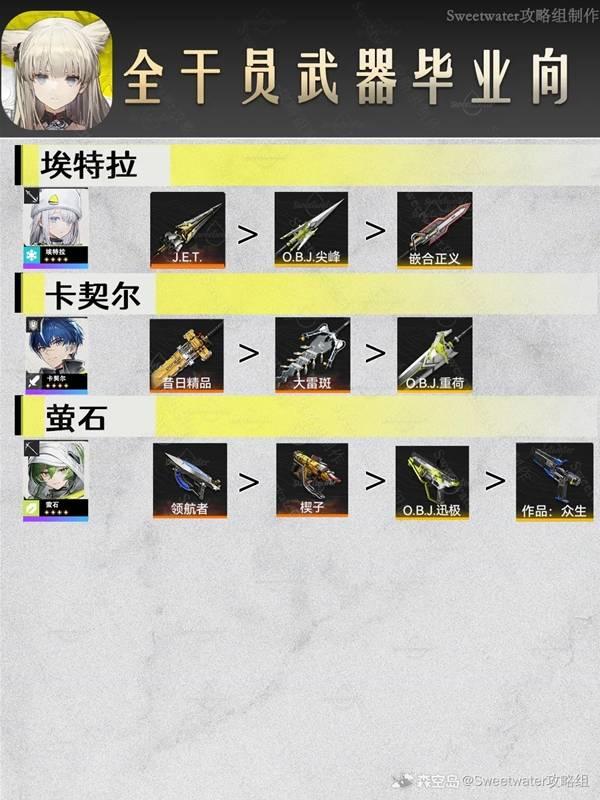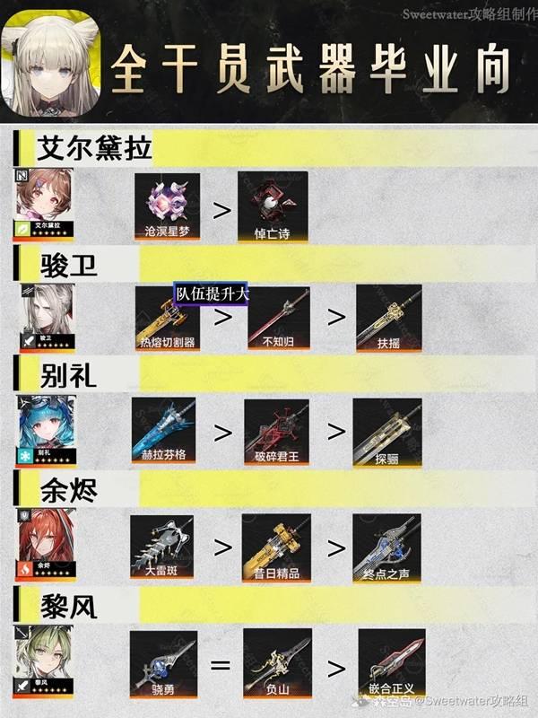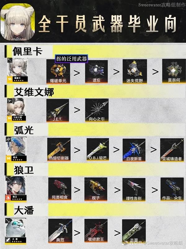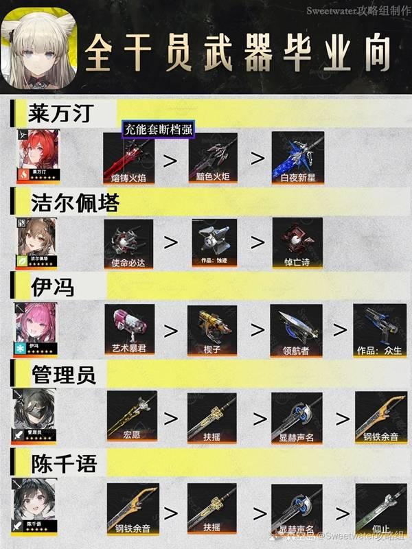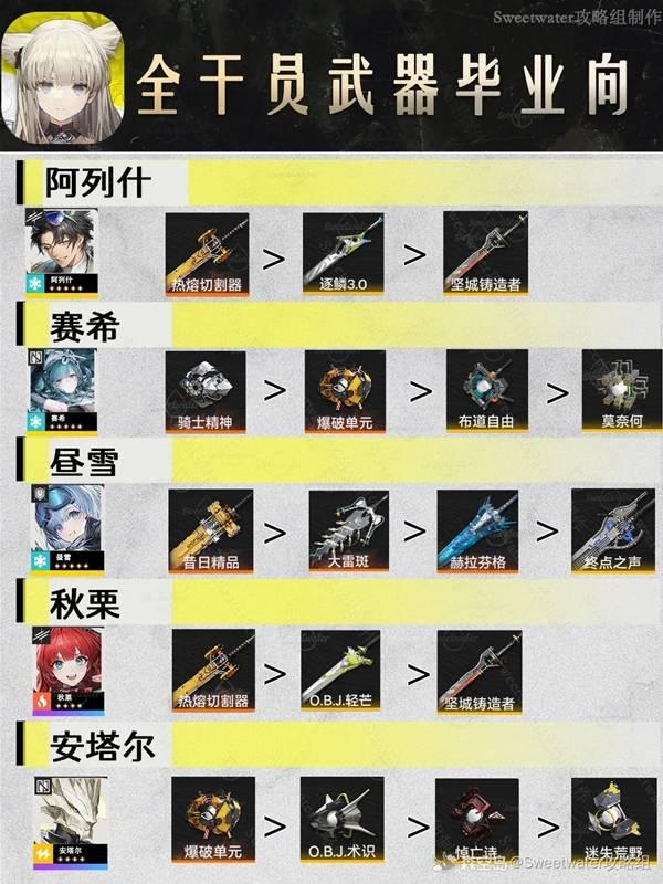 《明日方舟终末地》中武器的合理选择可以大幅强化干员的作战能力,那么每位干员的毕业武器都要怎么搭配呢?下面请看由“Sweetwater攻略组”为大家带来的《明日方舟终末地》全干员毕业武器推荐,希望可以帮助到大家。