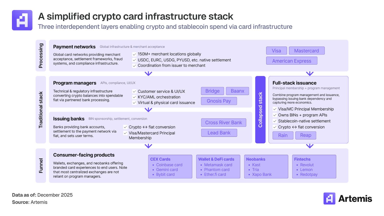 基础设施。加密卡业务由三层组成:支付网络(Visa、Mastercard)、卡项目管理方和发卡机构,以及面向消费者的终端产品。尽管 Visa 和 Mastercard 的卡项目数量几乎相同(均超 130 个),但 Visa 凭借与基础设施提供商的早期合作,占据了超 90% 的链上卡交易量。最重大的结构性发展是全栈发行方的出现——像 Rain 和 Reap 这样的公司,它们直接拥有会员资格,并将项目管理与发卡相结合,绕过传统发卡银行的依赖关系,从而在每笔交易中获取更多收益。