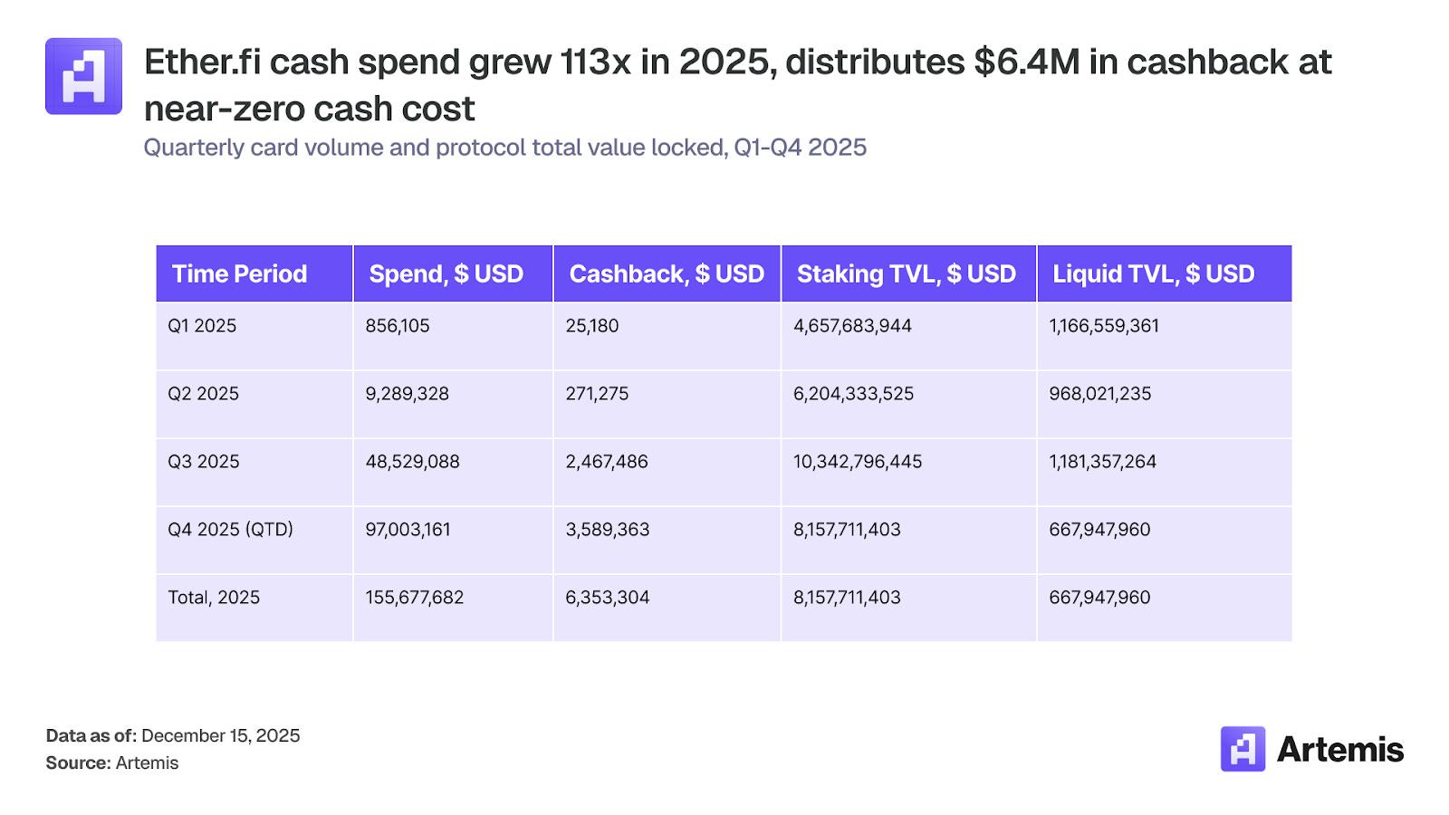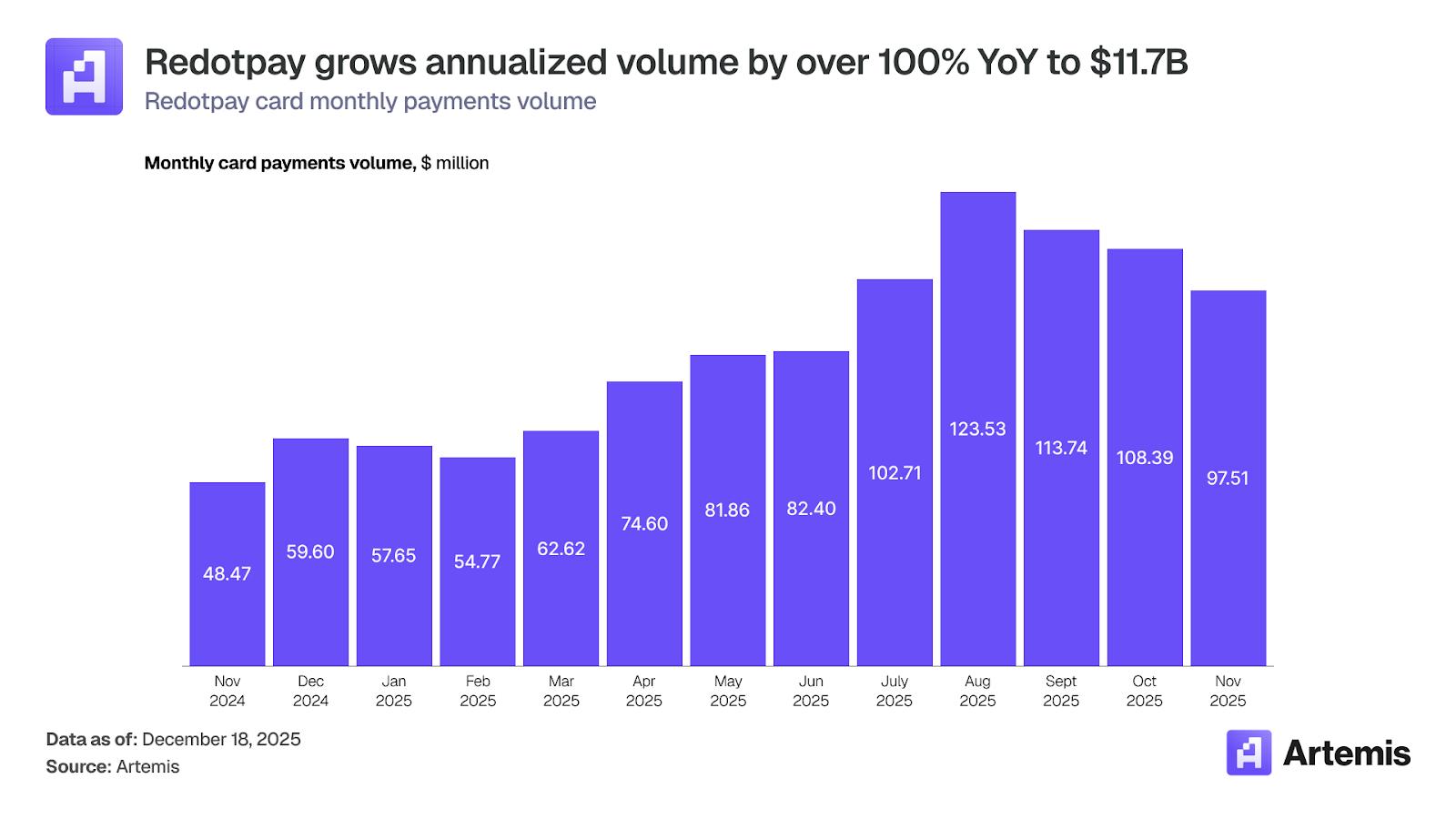 加密卡让用户能在传统商户处使用稳定币和加密货币进行消费,是数字支付领域增长最快的细分市场之一。其交易额从 2023 年初的每月约 1 亿美元增长到 2025 年底的超 15 亿美元,复合年增长率达 106%。按年计算,该市场规模现已超 180 亿美元,与同期仅增长 5% 的点对点(P2P)稳定币转账(190 亿美元)不相上下。