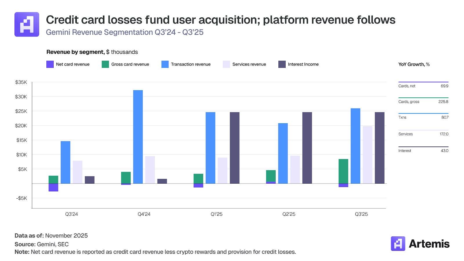 以法币或流动性强的加密货币(如 Gemini、Coinbase、Kraken)支付奖励的 CEX 会产生实际的美元成本,必须依靠交易手续费、利息收入和资产收益来弥补客户获取成本。在 2021 年 1 月收购 Blockrize 之后,Gemini 于 2022 年推出了带有加密货币返现奖励的信用卡计划。尽管 Gemini 信用卡业务持续亏损(见下图紫色部分显示的净信用卡收入),但由于其在用户获取和留存方面表现出色,Gemini 仍继续投资并运营其信用卡产品。