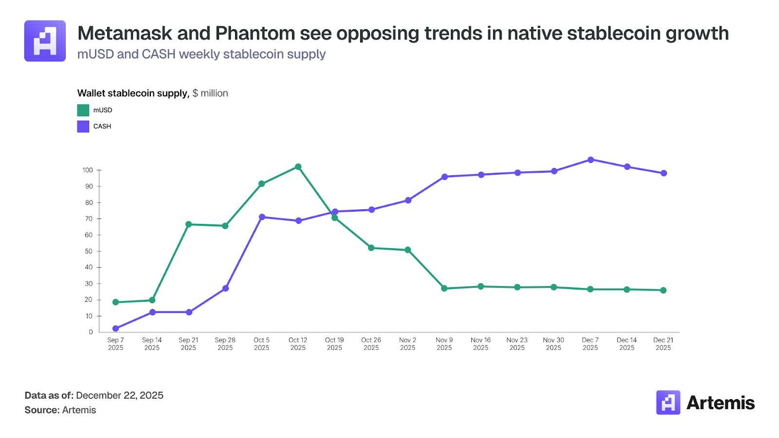 早期数据显示,两者的发展轨迹截然不同。Phantom 的 $CASH 供应量从 9 月份的约 2500 万美元稳步增长到 12 月底的约 1 亿美元,表明其用户接受度和留存率持续稳定。相比之下, Mask 的 mUSD 在 10 月初一度接近 1 亿美元,随后回落至约 2500 万美元,跌幅高达 75%。