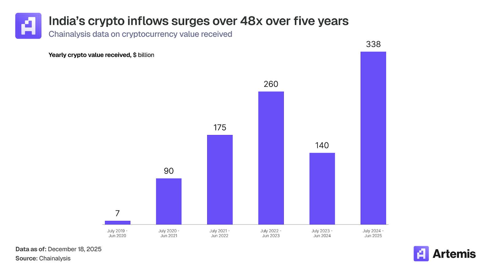 截至 2025 年 6 月的 12 个月里,印度凭借 3380 亿美元的资金流入成为亚太地区最大的加密市场,五年间增长了 48 倍。然而,如此庞大的交易量几乎完全游离于正规金融体系之外,造成了全球最大的“去银行化”缺口,即实际加密货币活动与受监管合规渠道之间的巨大鸿沟。