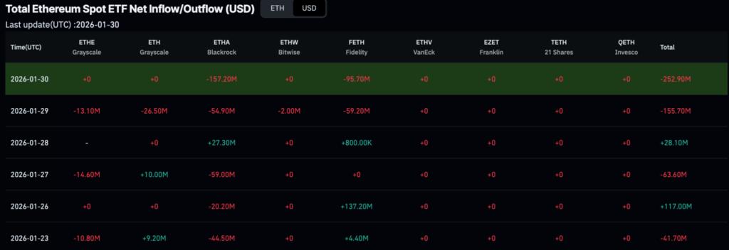 以太坊也呈现出类似的趋势,尽管规模较小。ETHA 在一周内持续遭到抛售,最终在 1 月 30 日达到 1.57 亿美元的巨额资金流出,此前一天其市值已蒸发近 5500 万美元。